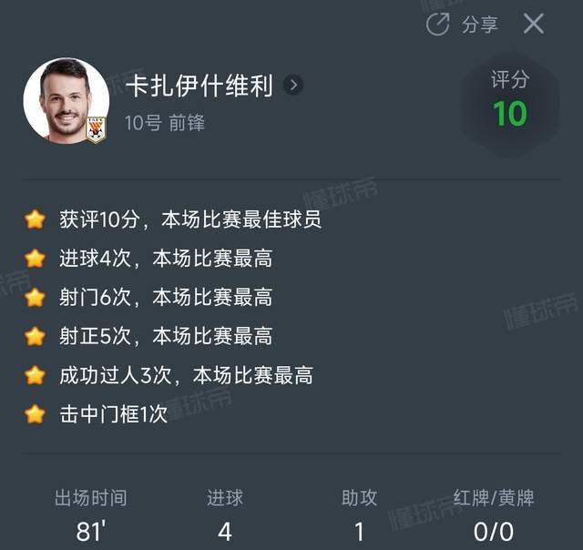 第一个,卡扎伊什维利本轮联赛贡献了4球1助攻,这是什么概念,之前的中超最佳球员,很多都是进2个球,或者1球1助攻就可以,卡扎伊什维利这完全是降维打击,另外,他这场比赛更是6项数据高居第一,除了进球之外,还有3次成功过人和1次击中门框,获评全场最高的10分满分。